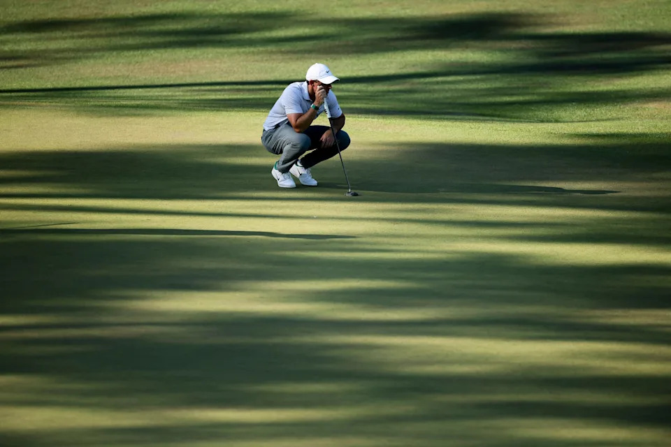 Rory McIlroy of Northern Ireland lines up a putt on the 15th green during the second round of the 2026 Masters Tournament at Augusta National Golf Club on April 10, 2026, in Augusta, Georgia.