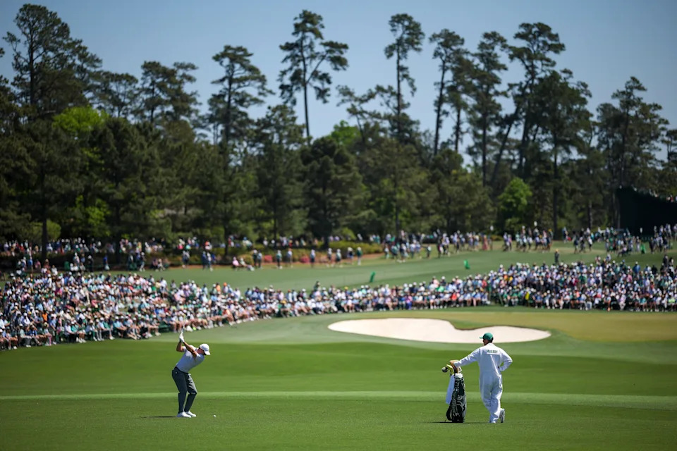 Above, Rory McIlroy of Northern Ireland plays his third shot on the second hole during the second round of the 2026 Masters Tournament at Augusta National Golf Club on April 10, 2026, in Augusta, Georgia.