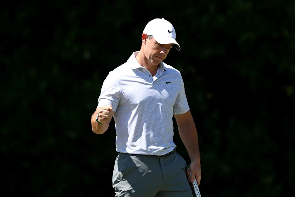Rory McIlroy of Northern Ireland waves on the eighth green during the second round of the 2026 Masters Tournament at Augusta National Golf Club on April 10, 2026, in Augusta, Georgia.