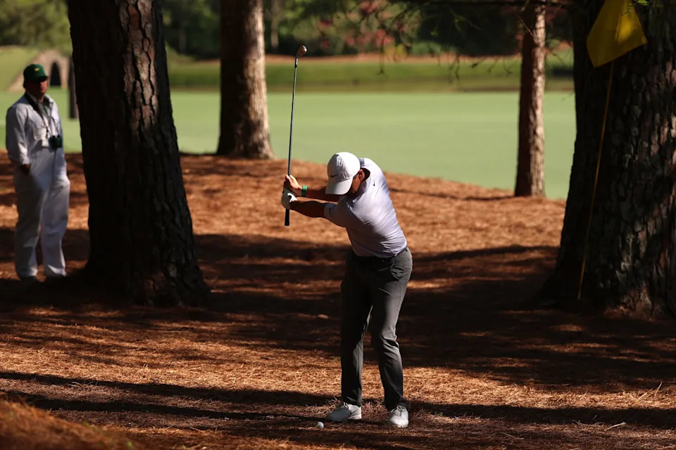 Rory McIlroy plays his shot from the pine straw on the thirteenth hole during the second round of the Masters Tournament at Augusta National Golf Club.
