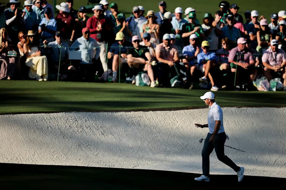 Rory McIlroy waves to patrons after walking off the 18th green during the second round of the Masters Tournament at Augusta National Golf Club.