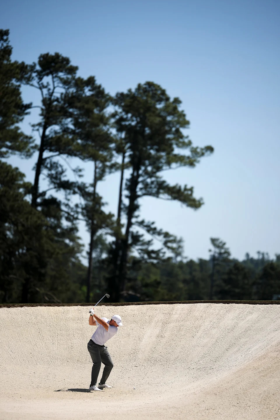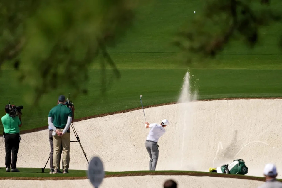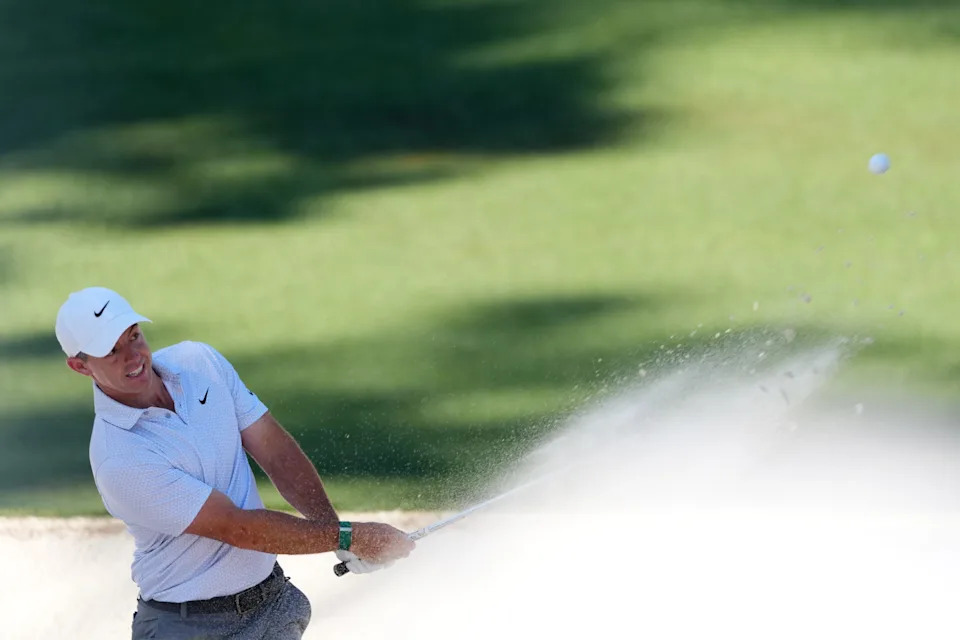 Rory McIlroy of Northern Ireland plays a shot from a bunker on the eighth hole during the second round of the 2026 Masters Tournament at Augusta National Golf Club on April 10, 2026, in Augusta, Georgia.
