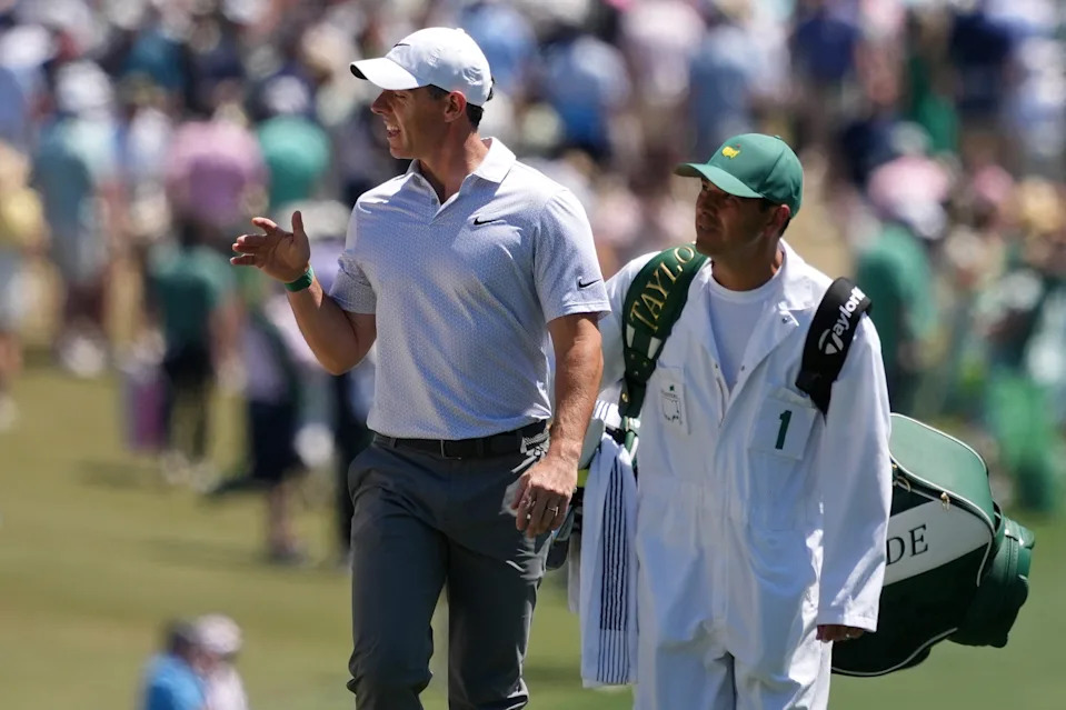 Rory McIlroy reacts as he walks down the first fairway with caddie Harry Diamond during the second round of the Masters Tournament at Augusta National Golf Club.