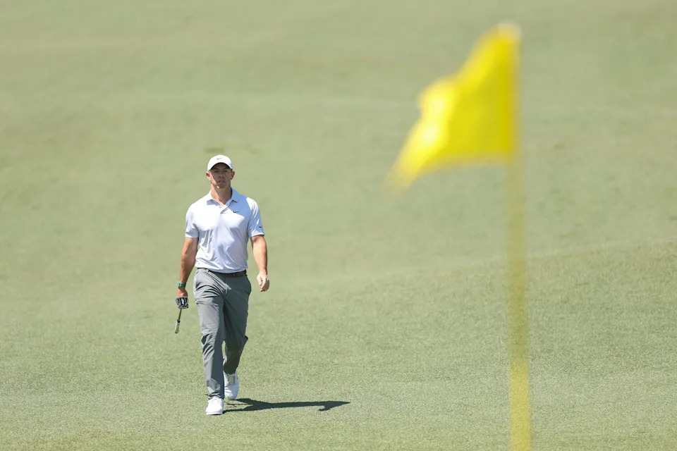 Rory McIlroy of Northern Ireland walks to the 15th green during the second round of the 2026 Masters Tournament at Augusta National Golf Club on April 10, 2026, in Augusta, Georgia.