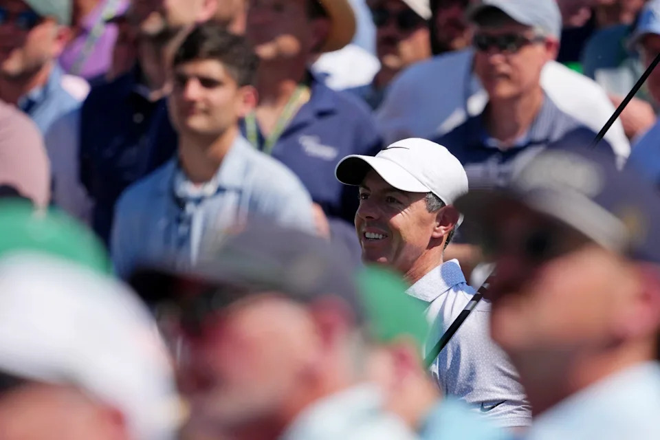 Rory McIlroy of Northern Ireland acknowledges the crowd on the first hole during the second round of the 2026 Masters Tournament at Augusta National Golf Club on April 10, 2026, in Augusta, Georgia.