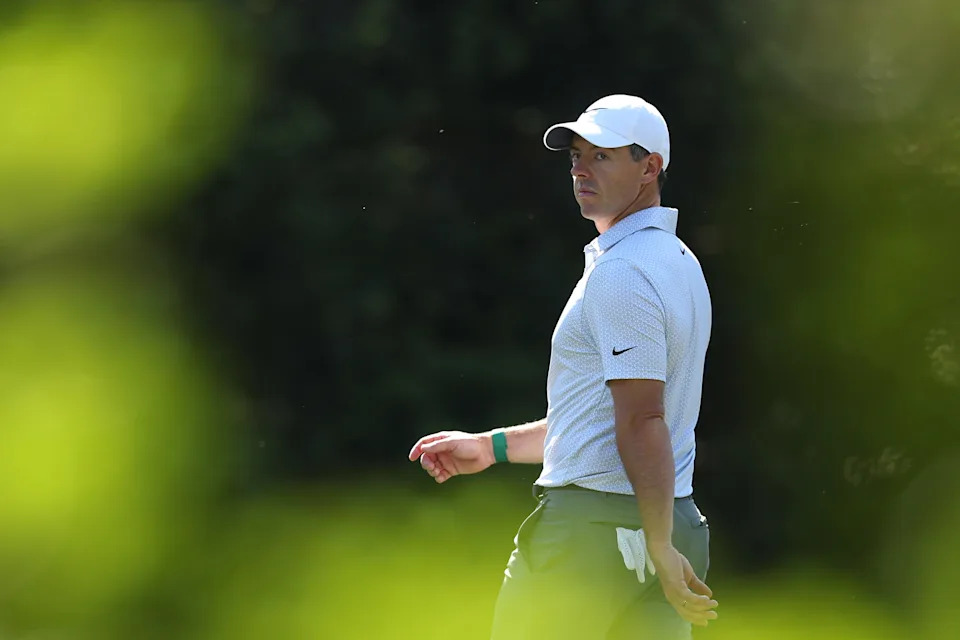 Rory McIlroy of Northern Ireland looks on from the third green during the second round of the 2026 Masters Tournament at Augusta National Golf Club on April 10, 2026, in Augusta, Georgia.