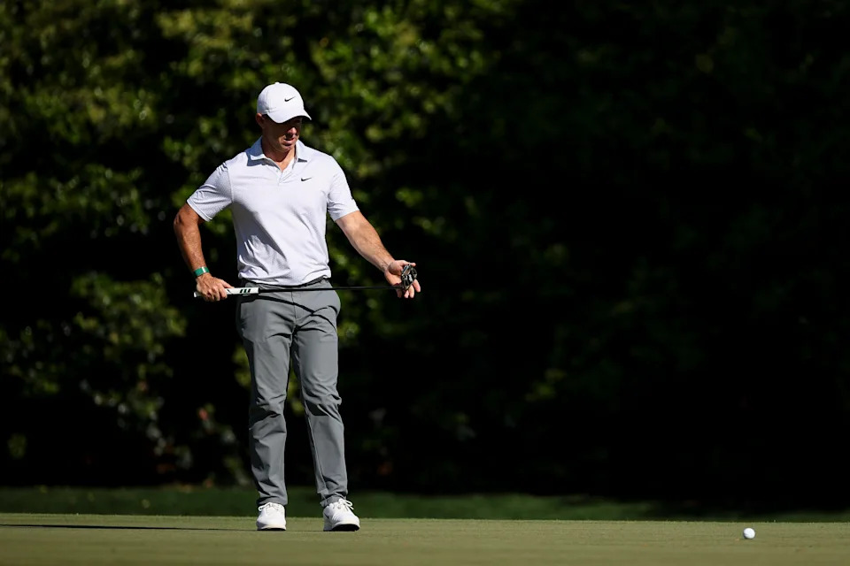 Rory McIlroy of Northern Ireland reacts on the 15th green during the second round of the 2026 Masters Tournament at Augusta National Golf Club on April 10, 2026, in Augusta, Georgia.