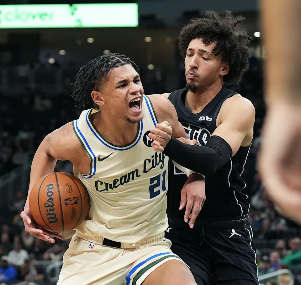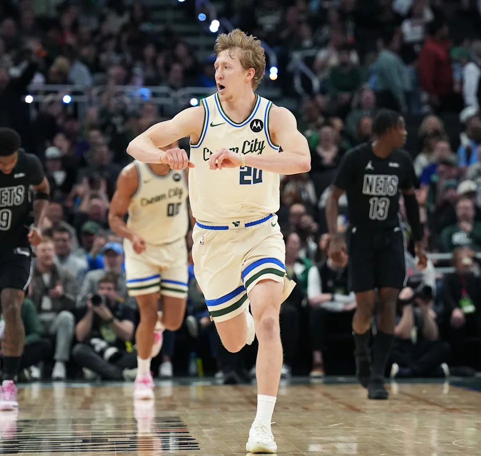 Milwaukee Bucks guard AJ Green (20) celebrates scoring three point basket during the first half of the game against the Brooklyn Nets on Friday April 10, 2026 at Fiserv Forum in Milwaukee, Wisconsin.