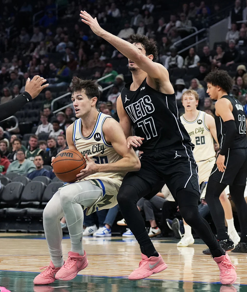 Brooklyn Nets guard Ben Saraf (77) guards Milwaukee Bucks guard Cormac Ryan (30) during the second half of their game on Friday April 10, 2026 at Fiserv Forum in Milwaukee, Wisconsin.