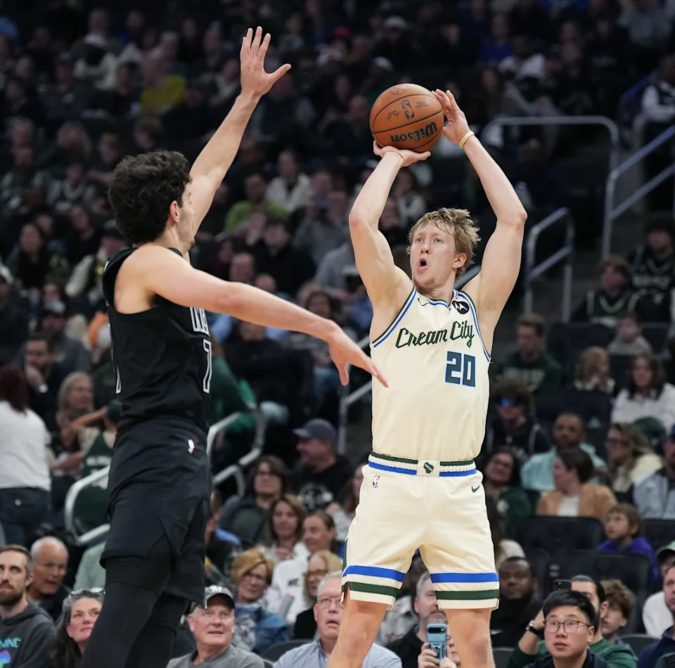 Milwaukee Bucks guard AJ Green (20) scores a three point basket as Brooklyn Nets guard Ben Saraf (77) attempted to block him during the second half of their game on Friday April 10, 2026 at Fiserv Forum in Milwaukee, Wisconsin.