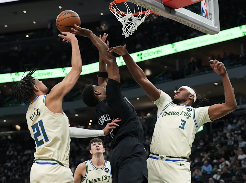 Milwaukee Bucks center Myles Turner (3) and Milwaukee Bucks forward Ousmane Dieng (21) block the shot from Brooklyn Nets forward E.J. Liddell (9) during the first half of their game on Friday April 10, 2026 at Fiserv Forum in Milwaukee, Wisconsin.