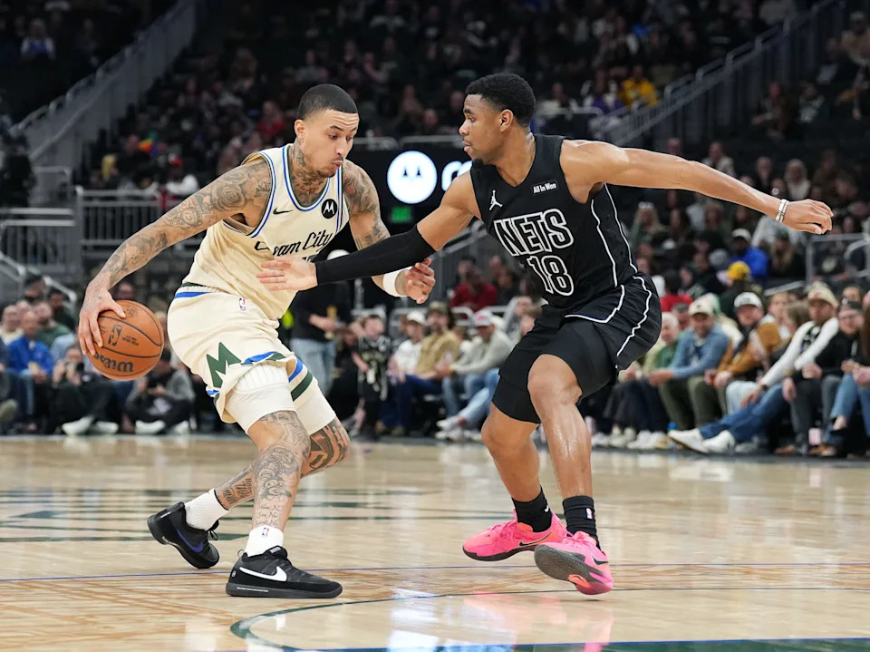 Milwaukee Bucks forward Kyle Kuzma (18) guards Brooklyn Nets guard Malachi Smith (18) during the first half of their game on Friday April 10, 2026 at Fiserv Forum in Milwaukee, Wisconsin.