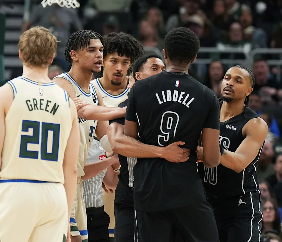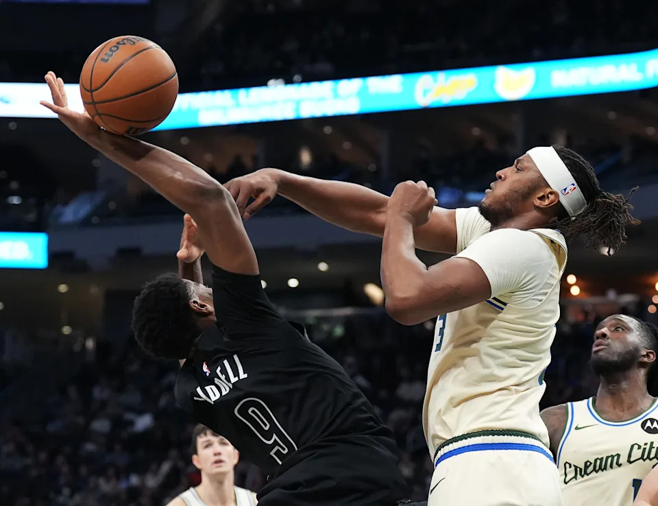 Brooklyn Nets forward E.J. Liddell (9) holds on to Milwaukee Bucks center Myles Turner (3) during the second half of their game on Friday April 10, 2026 at Fiserv Forum in Milwaukee, Wisconsin.