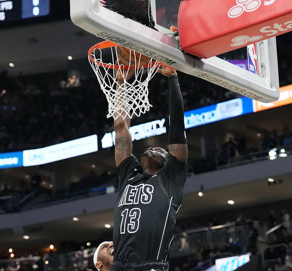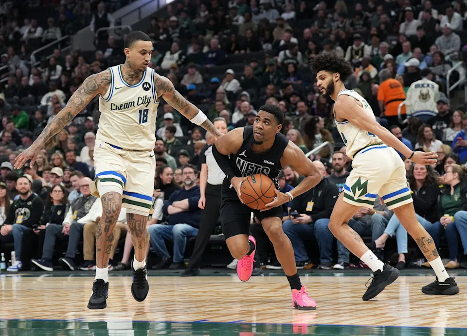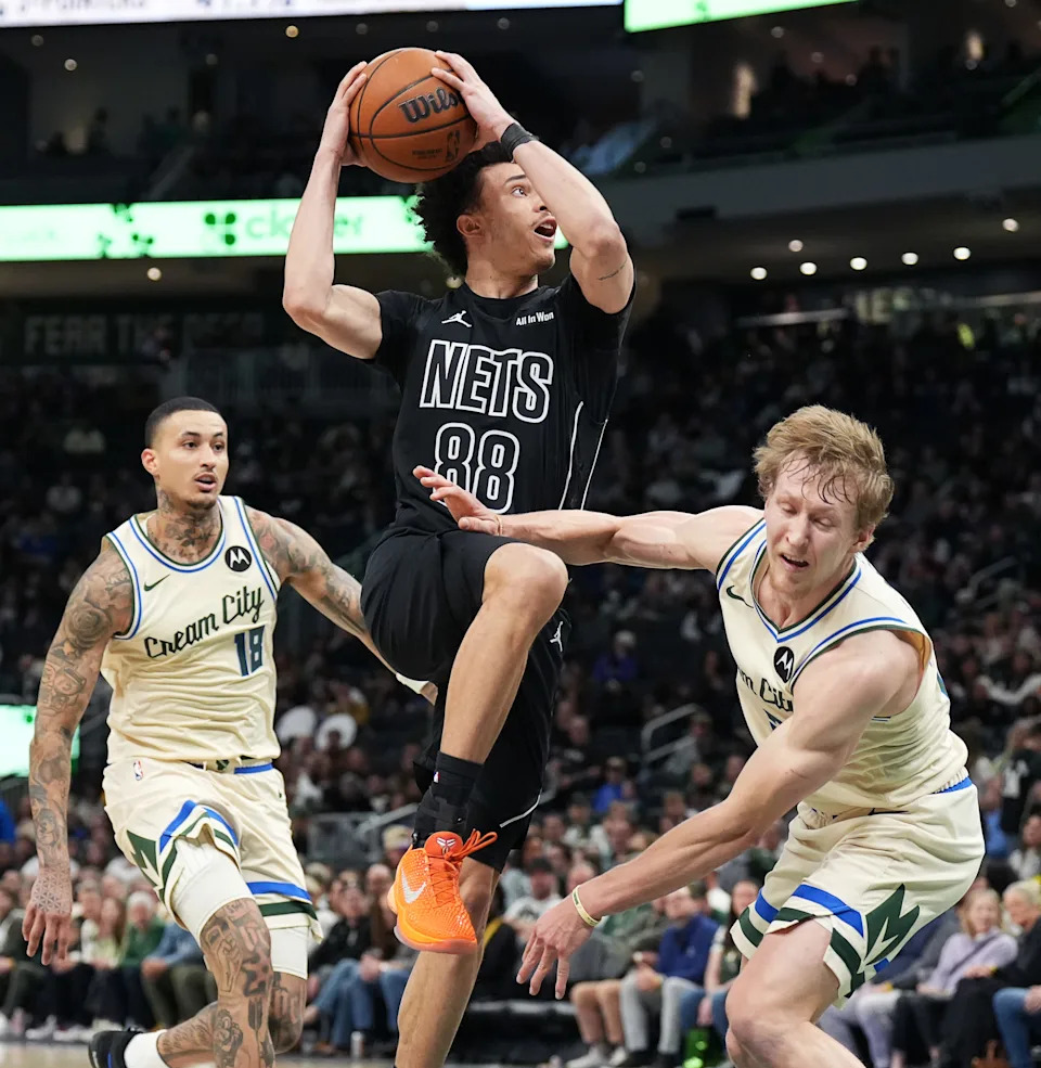 Brooklyn Nets guard Nolan Traore (88) drives to the basket to score and collides with Milwaukee Bucks guard AJ Green (20) during the first half of their game on Friday April 10, 2026 at Fiserv Forum in Milwaukee, Wisconsin.