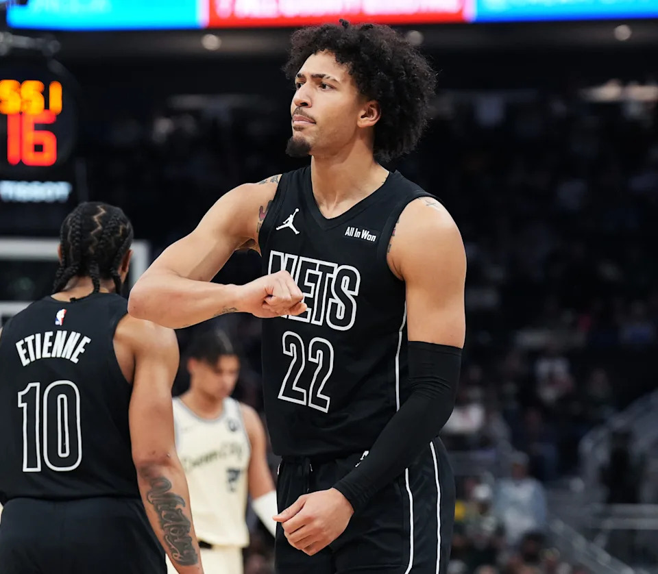 Brooklyn Nets forward Jalen Wilson (22) signals that Milwaukee Bucks forward Ousmane Dieng (21) pushed him during the second half of their game on Friday April 10, 2026 at Fiserv Forum in Milwaukee, Wisconsin.