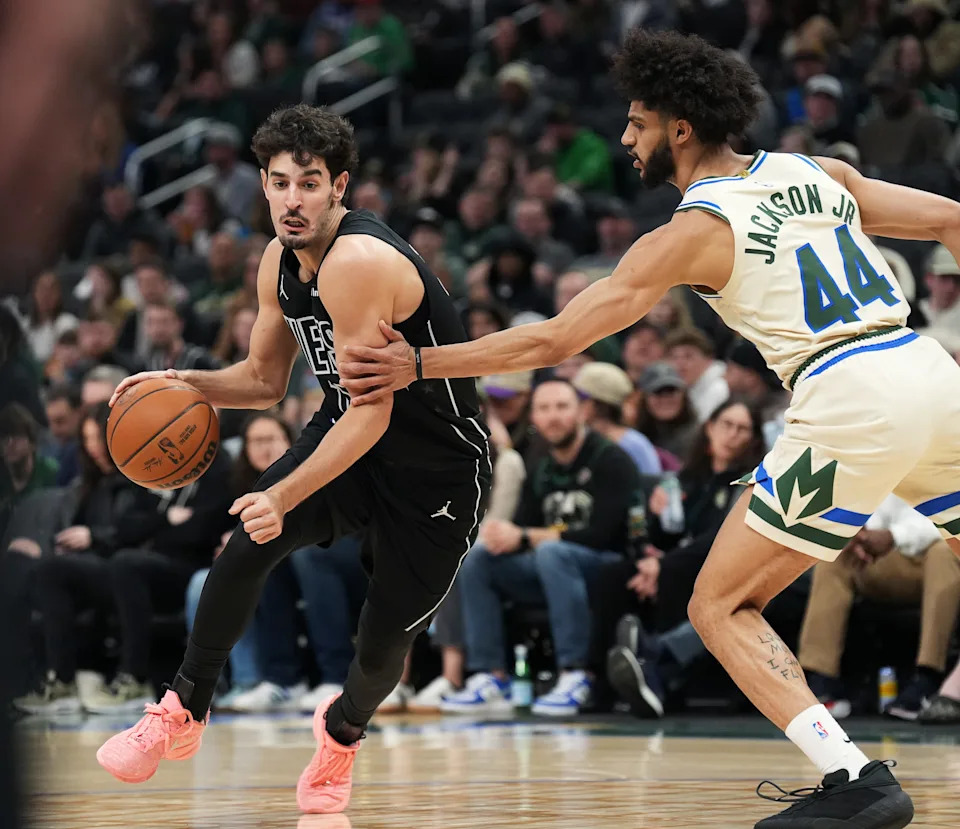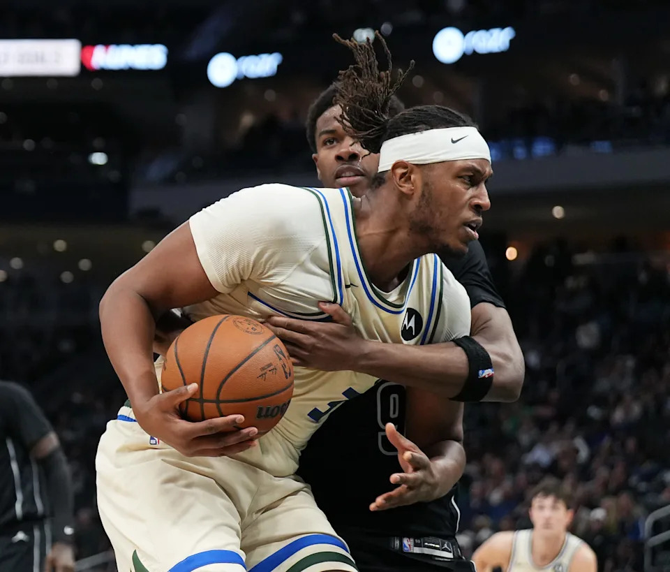 Milwaukee Bucks forward Ousmane Dieng (21) posts up against Brooklyn Nets forward Jalen Wilson (22) during the second half of their game on Friday April 10, 2026 at Fiserv Forum in Milwaukee, Wisconsin.