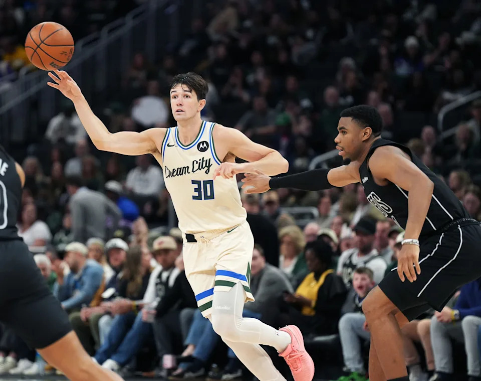 Milwaukee Bucks guard Cormac Ryan (30) looks to pass the ball during the second half of the game against the Brooklyn Nets on Friday April 10, 2026 at Fiserv Forum in Milwaukee, Wisconsin.