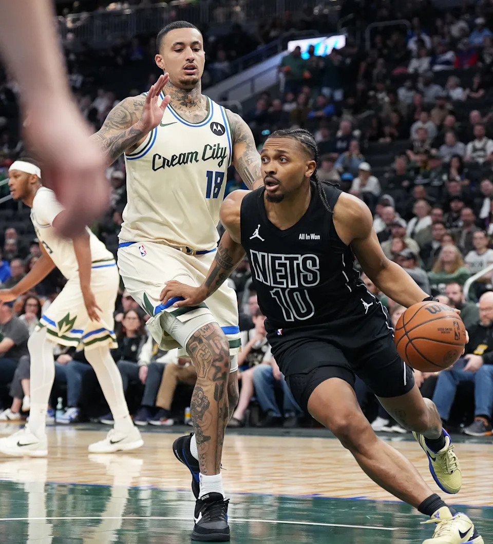 Brooklyn Nets guard Malachi Smith (18) guards Milwaukee Bucks forward Kyle Kuzma (18) during the second half of their game on Friday April 10, 2026 at Fiserv Forum in Milwaukee, Wisconsin.