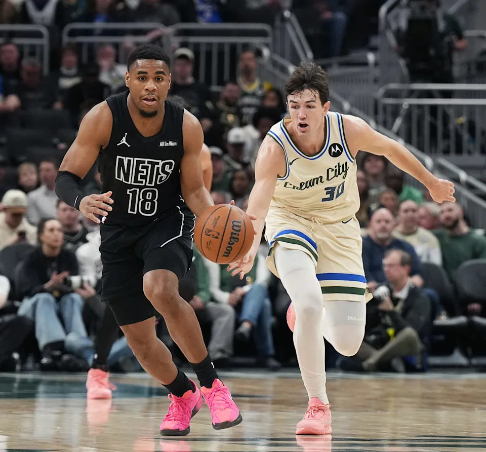 Brooklyn Nets guard Malachi Smith (18) brings the ball up court as Milwaukee Bucks guard Cormac Ryan (30) tries to guard him during the first half of their game on Friday April 10, 2026 at Fiserv Forum in Milwaukee, Wisconsin.