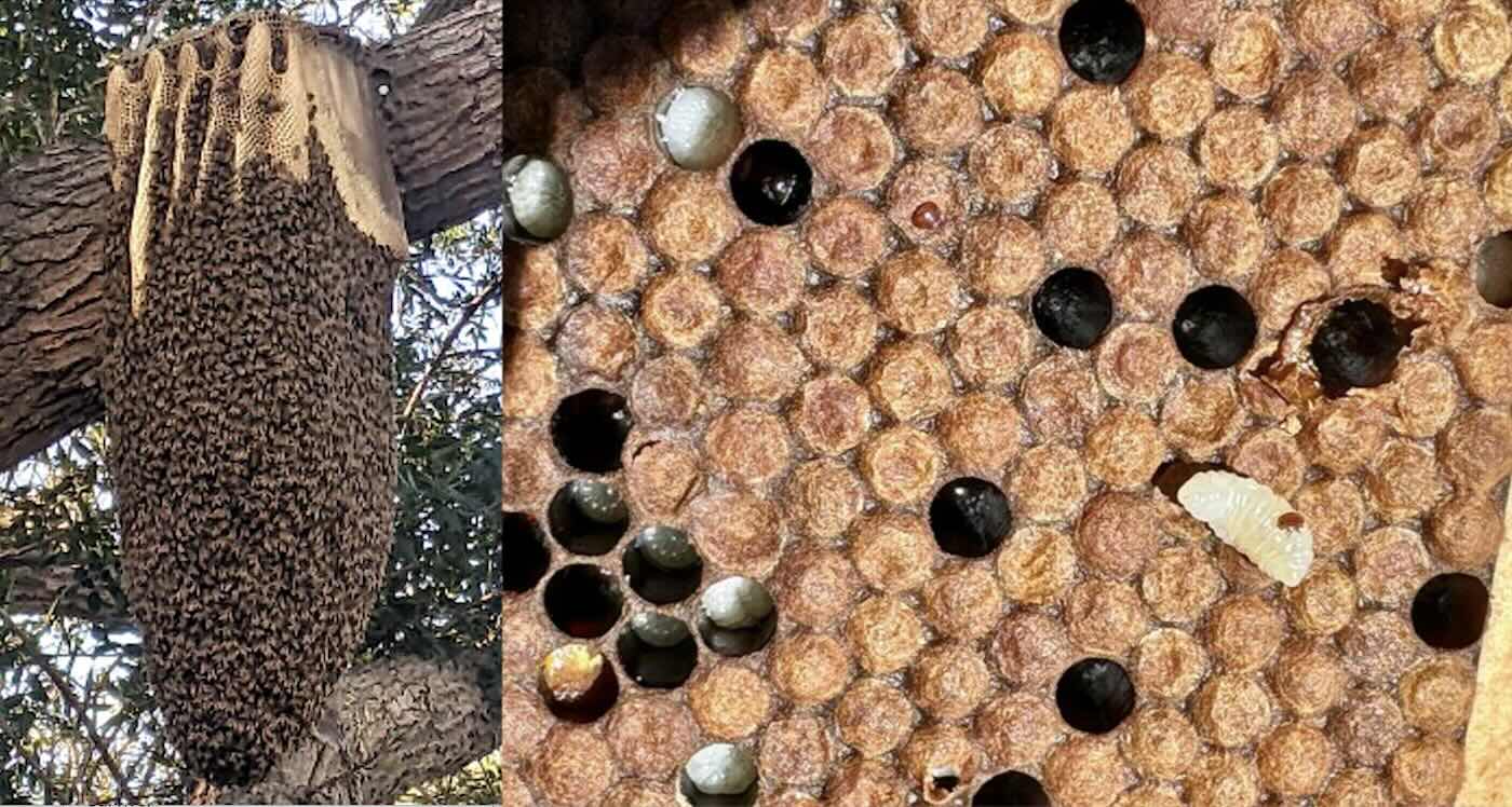 Hive hanging from tree; and Varroa mite on honeybee larvae – Credit: Boris Baer and Genesis Chong-Echavez at University of California-Riverside