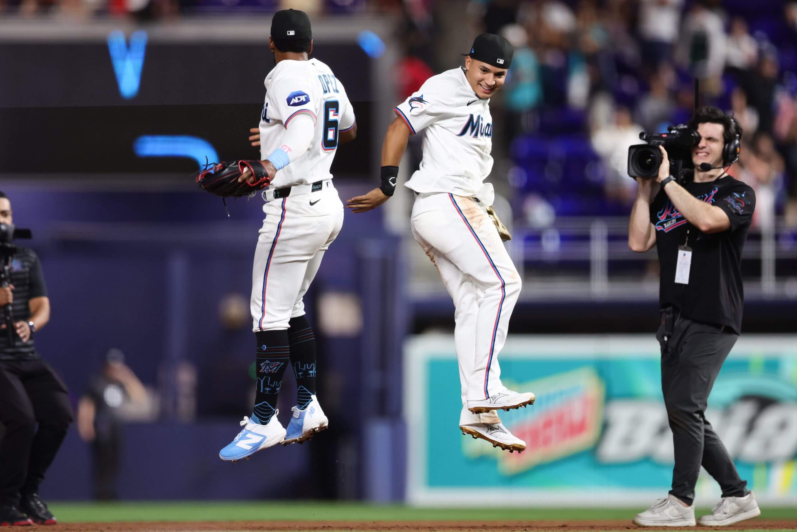 Sanoja (right) and Marlins infielder Otto Lopez celebrate the team’s Opening Day win over Colorado last month. (Megan Briggs / Getty Images)
