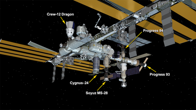 April 13, 2026: International Space Station Configuration. Five spaceships are parked at the space station including the SpaceX Crew-12 Dragon, Northrop Grumman’s Cygnus XL, the Soyuz MS-28 crew ship, and the Progress 93 and 94 resupply ships. Graphic: NASA