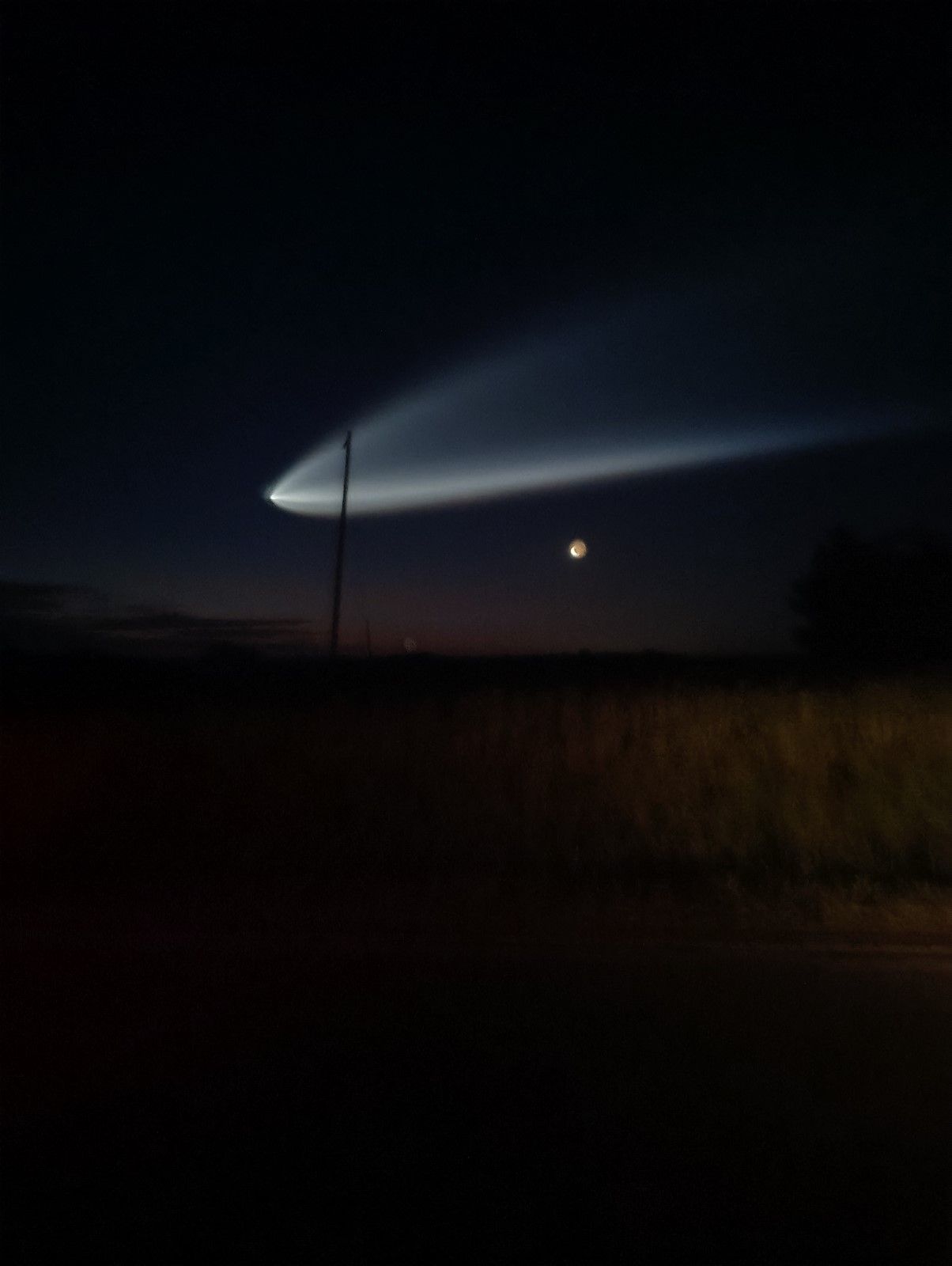 Emerging from Cape Canaveral, Florida, the rocket’s vapor trails were illuminated by the rising sun farther east.