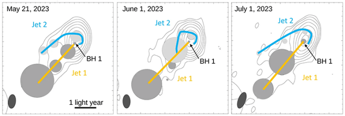The jet from the first black hole points toward Earth, making it considerably bright to radio telescopes. The second jet starts behind the first black hole, moving counterclockwise around it. Because of the gravitational lensing of the first black hole, the radiation emitted by the second reaches us on a warped path.