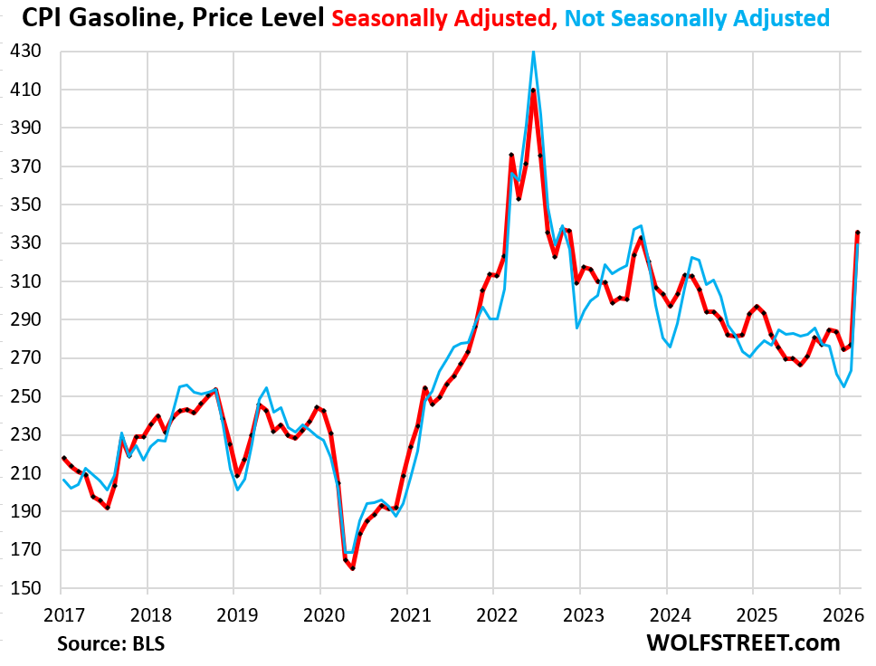 The CPI for gasoline spiked by 21% seasonally adjusted and by 25% not seasonally adjusted in March from February.