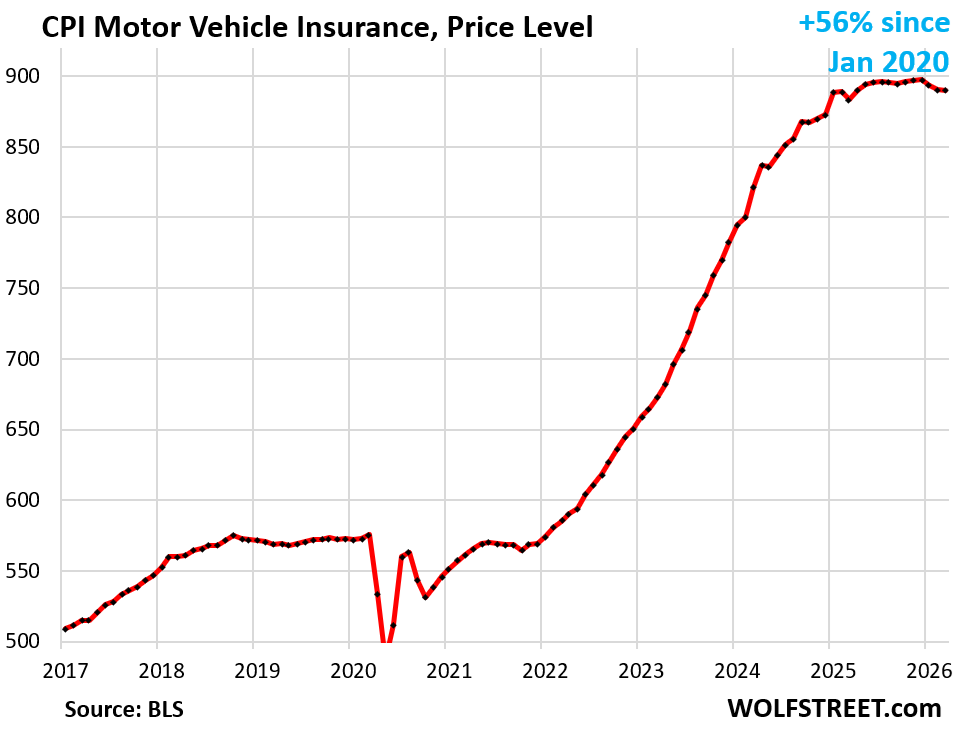 The CPI for motor vehicle insurance has been flat to down since the peak in mid-2025. In March it was essentially unchanged from February, and up only 0.8% from a year ago.