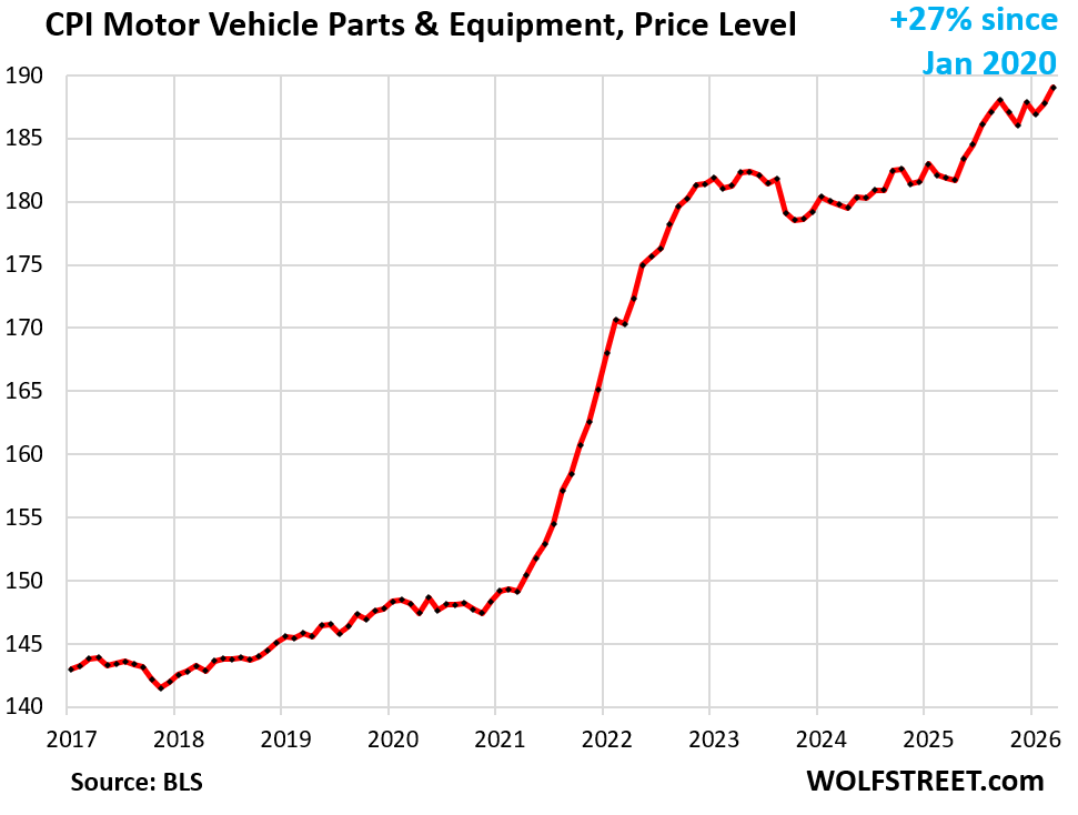 The CPI for motor vehicle parts and equipment jumped by 0.7% in March from February. Year-over-year, and from three years ago (March 2023), it was up by 3.9%.