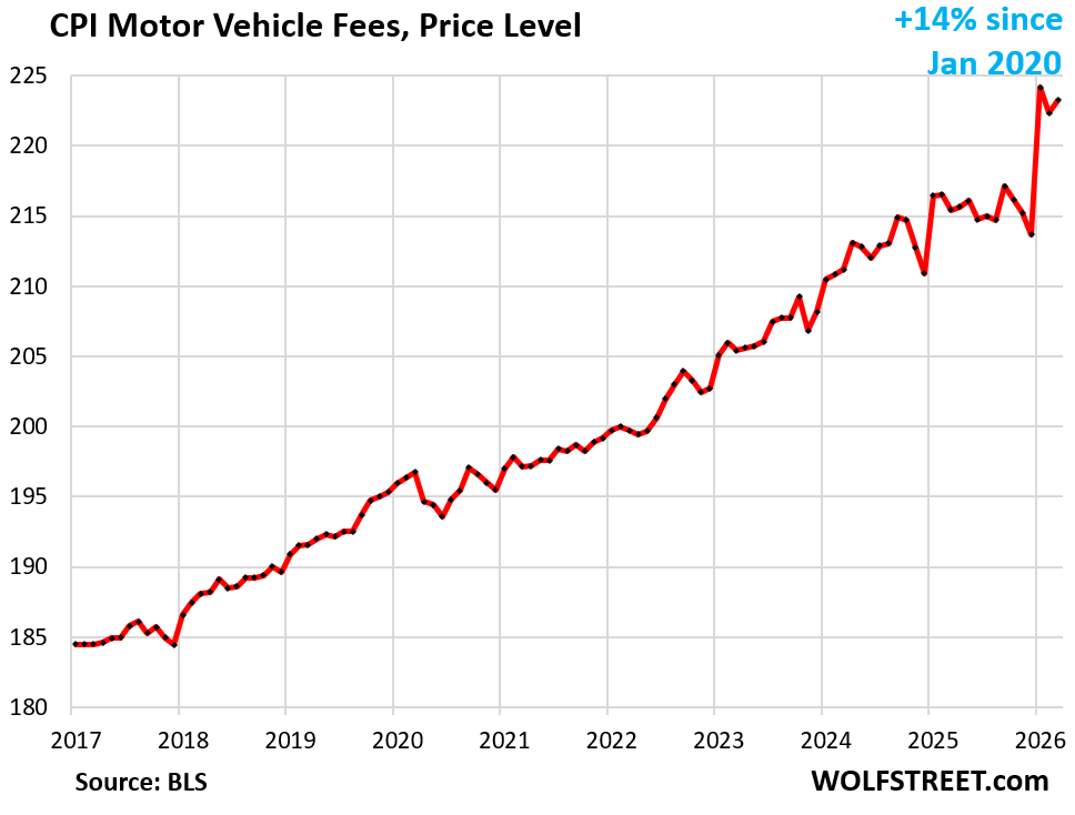 The CPI for motor vehicle fees rose by 0.42% in March and by 3.6% year-over-year, including the freak spike in January.