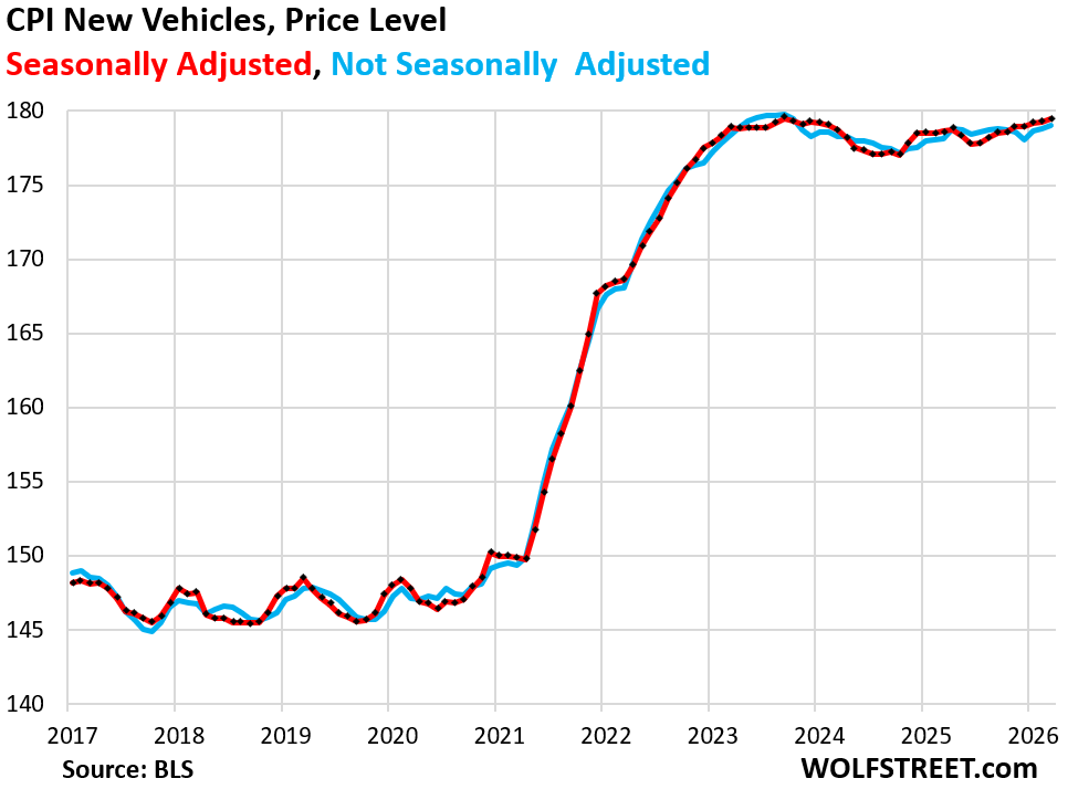 The CPI for new vehicles inched up 0.1% in March from April, and by 0.47% year-over-year, and is below where it had been at the peak in mid-2023.
