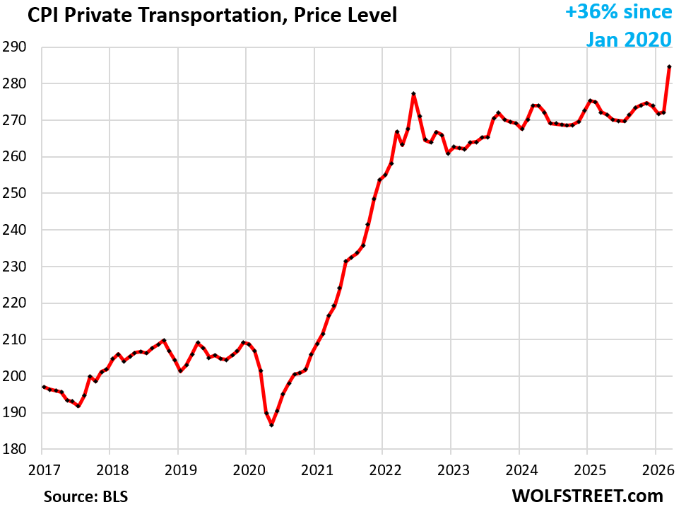 The CPI for “private transportation,” which combines the above categories into one index, spiked by 4.6% in March from February, to a new record, surpassing for the first time June 2022, driven by the spike in gasoline prices in March.