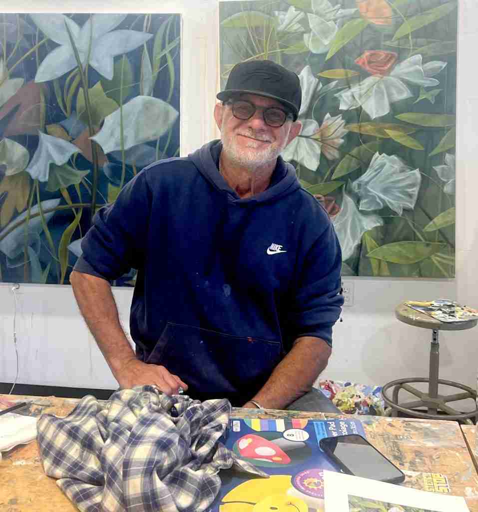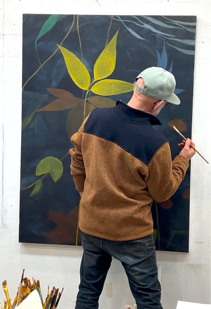 I have been lucky enough to go to his studio and see his work when I go to pilates classes at Pilates Art Studio which is owned by his wife, Sarah Di Vincenzo. A bright painting of Mark’s always adorns the far wall, providing inspiration and happiness to all that work out there.