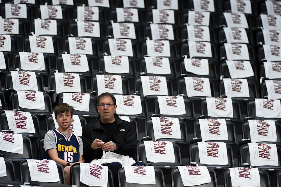 Fans arrive to watch warmups before game one of the first round of the 2026 NBA Playoffs between the Denver Nuggets and the Minnesota Timberwolves at Ball Arena.