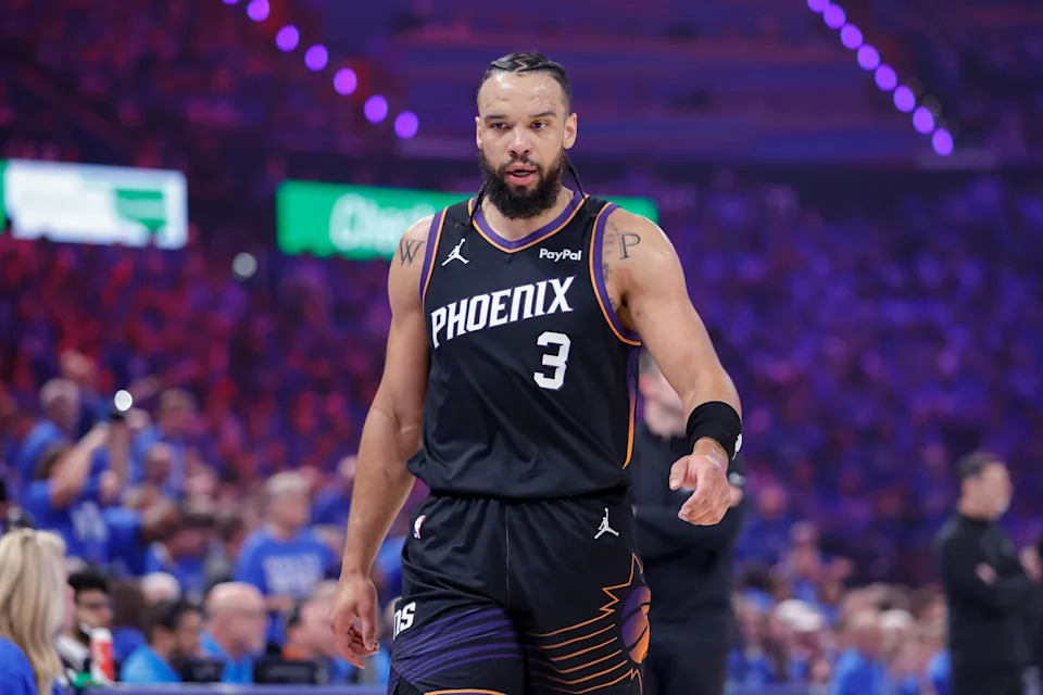 Phoenix Suns forward Dillon Brooks (3) walks down the court after a play against the Oklahoma City Thunder in the first quarter during game one of the first round of the 2026 NBA Playoffs at Paycom Center in Oklahoma City on April 19, 2026.