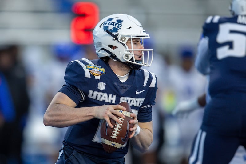 Utah State quarterback McCae Hillstead (10) looks downfield against Georgia State late in the second half of the Famous Idaho Potato Bowl NCAA college football game, Saturday, Dec. 23, 2023, in Boise, Idaho. Georgia State won 45-22. (AP Photo/Steve Conner) | Steve Conner, Associated Press