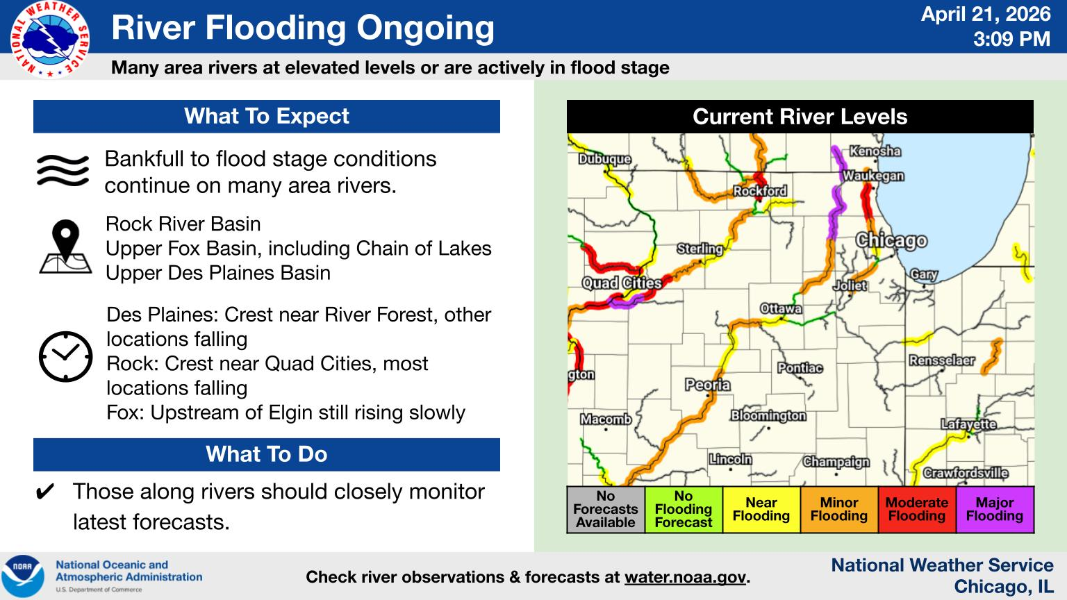 River gauges Tuesday evening showed water levels still rising slowly, according to the National Weather Service, though the rate of increase has slowed compared to earlier in the week. Channel Lake exceeded major flood stage Monday, while Fox Lake and Nippersink Lake reached major flood stage Tuesday.