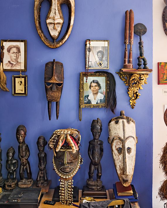 The Shrine A self-portrait by Preston’s father, John Lee, from the 1930s is surrounded by photographs of paternal relatives. The large sculpture of Preston’s likeness was carved in Ghana.