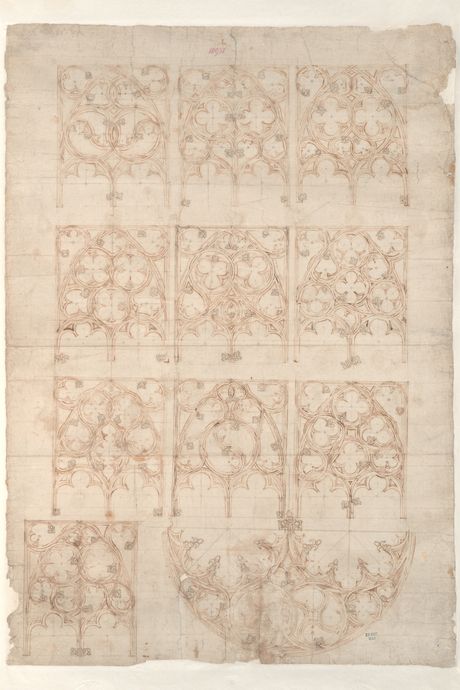 The earliest work here is a drawing from around 1260, showing part of the façade of Strasbourg Cathedral, but it is so precise and vivid, so assured in its technique, that it must surely have emerged from a long tradition. What was new in Strasbourg in the 13th century was not the practice but the recordkeeping. Even so, scholars can rarely be sure who designed what when, or whether a given drawing was made as a preliminary sketch, an assembly manual for construction workers, or a record after the fact. Every Gothic cathedral is the product of ideas that altered over generations, ambitions abandoned or superseded, compromises with ballooning budgets, labor shortages, or bottlenecks in the supply chain from quarries and forests and mines. The drawings, too, evolved, passing from hand to hand.