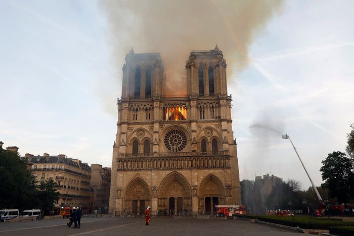 A fire that broke out on April 19, 2019, destroyed the roof and Viollet-le-Duc’s spire, though not the statues, which had been removed the day before for restoration.