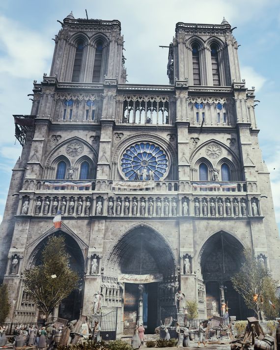 From left: Eugène-Emmanuel Viollet-le-Duc (French, 1814–79); Jean-Baptiste-Antoine Lassus (French, 1807–57): West elevation of Notre-Dame de Paris, competition drawing, 1843. Photo: Courtesy of Bard Graduate CenterBefore the fire, the video-game company Ubisoft had devoted 5,000 hours of research to producing a detailed digital reconstruction of Notre-Dame for the game Assassin’s Creed. Although the game designers strove for medieval period accuracy, they bent chronology and replaced the original spire with Viollet-le-Duc’s taller, more dramatic version. Photo: Ubisoft