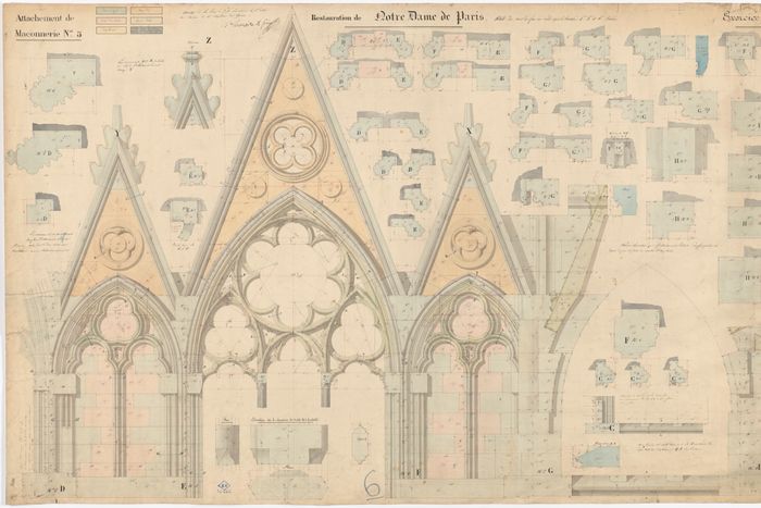 Jean-Baptiste-Antoine Lassus; Eugène-Emmanuel Viollet-le-Duc; and Émile Boeswillwald, Janvier; Lemaire et frères (contractors): Southern choir aisle of Notre-Dame de Paris, shop drawing of the gables of the fourth, fifth, and sixth bays after the transept, 1847.