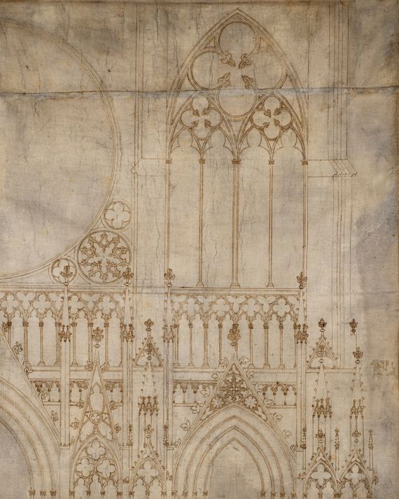 The oldest surviving architectural drawings are of Strasbourg Cathedral, which was begun around 1250, but this façade elevation from about a decade later is so visually sophisticated that it suggests a long preexisting practice.