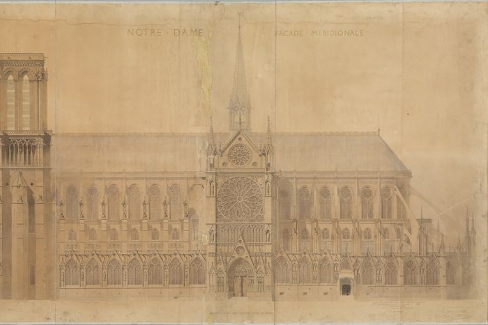 Viollet-le-Duc’s flabbergasting virtuosity with that tradition helped him and his partner Jean-Baptiste-Antoine Lassus win a government-sponsored competition to restore the cathedral. By 1843, Notre-Dame had been deconsecrated, abused, and neglected. In luminous drawings that had the texture of authenticity, they imagined the resurrection of a Gothic carcass: eroded limestone made new, blurred lines re-etched, vanished finials replaced, the accretions of the 18th century carted away. In breathtaking detail, we see how the partners conceived the renewal of Notre-Dame as a practical demonstration of France’s unique genius.