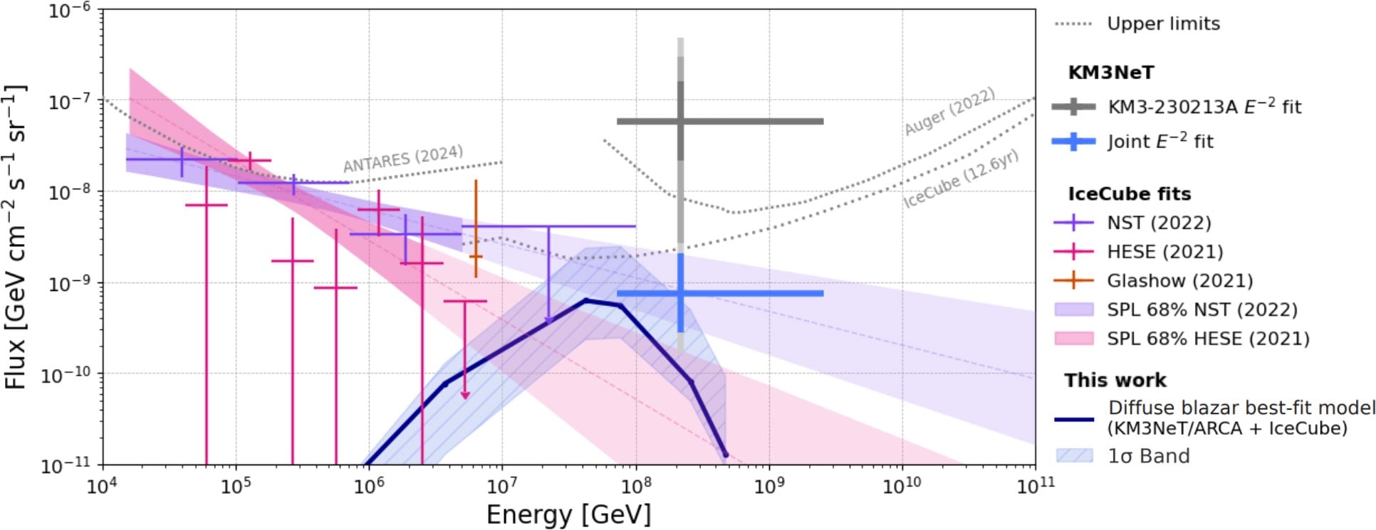 Diffuse Neutrino Flux as a Function of EnergyDiffuse neutrino flux as a function of energy. The blue curve shows the best-fit model for neutrinos produced by a population of blazars, compared with measurements from KM3NeT and IceCube. Credit: KM3NeT