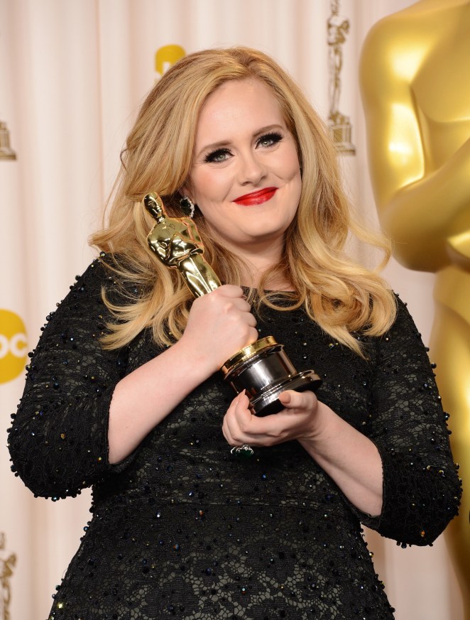HOLLYWOOD, CA – FEBRUARY 24: Singer Adele, winner of the Best Original Song award for “Skyfall,” poses in the press room during the Oscars held at Loews Hollywood Hotel on February 24, 2013, in Hollywood, California. (Photo by Jason Merritt/Getty Images)