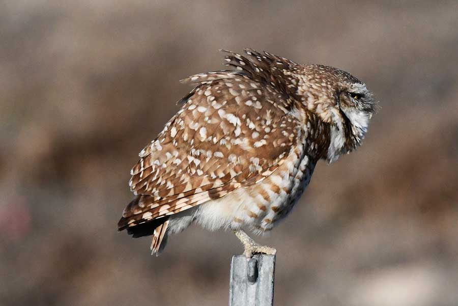 A burrowing owl tries to protect itself from a strong wind. It was spotted in northeast Idaho in April 2026. | Bill Schiess, EastIdahoNews.com