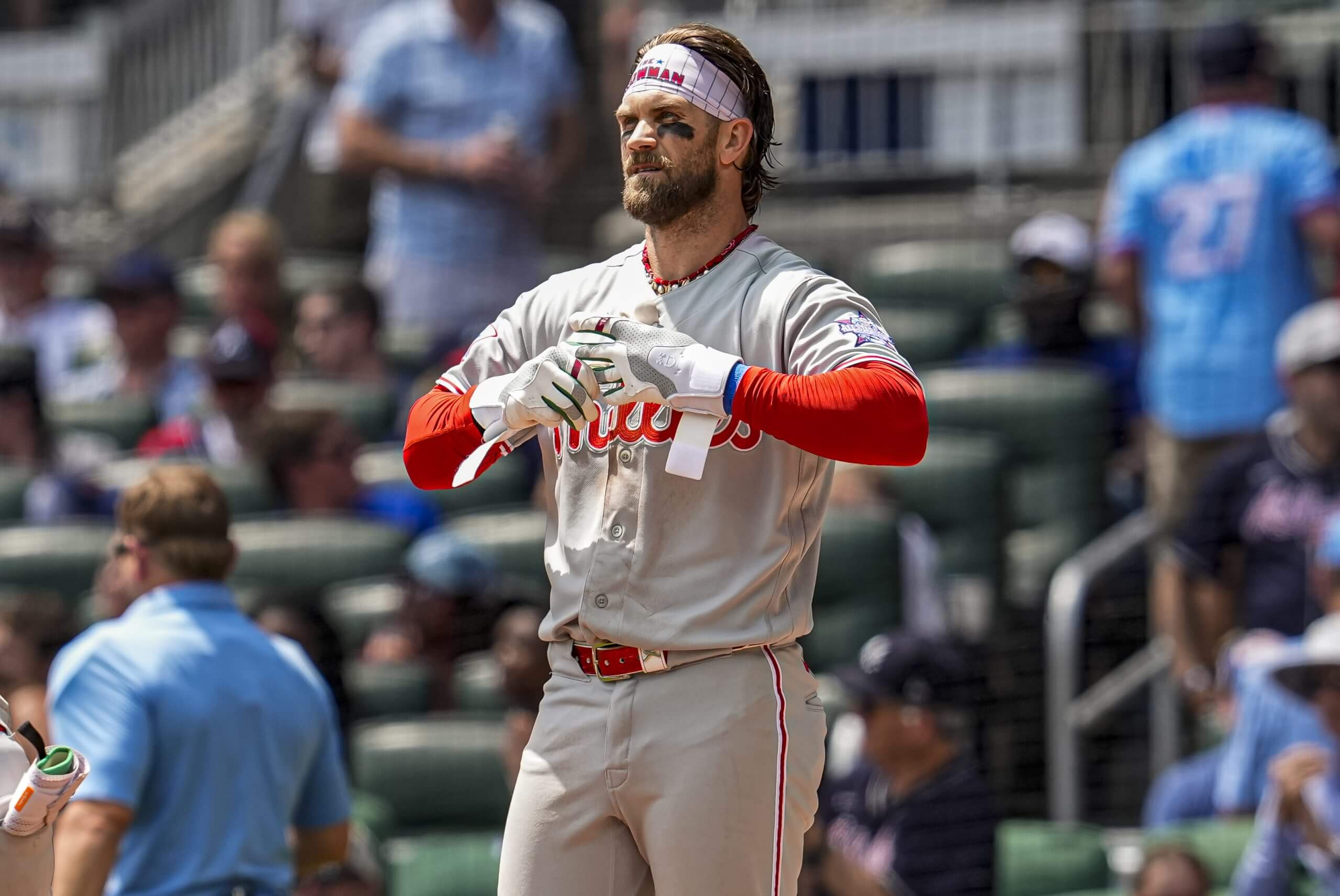 Bryce Harper removes his batting gloves after striking out with the bases loaded in the third inning. (Dale Zanine / Imagn Images)